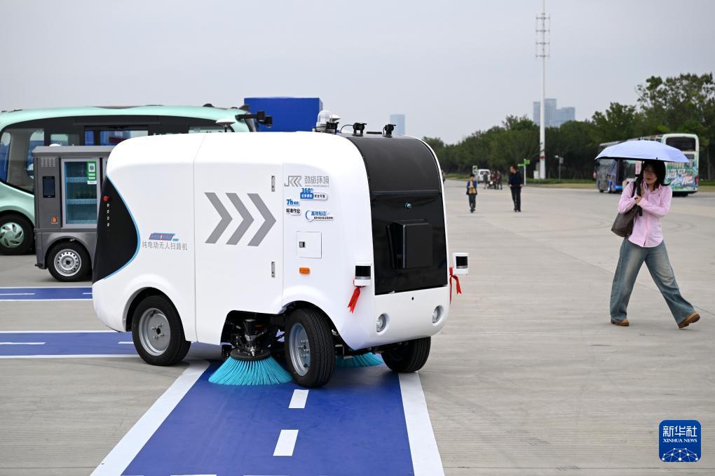 9月21日,观众在“全空间无人体系成果展”上参观一款纯电动无人扫路机。新华社记者 黄博涵 摄