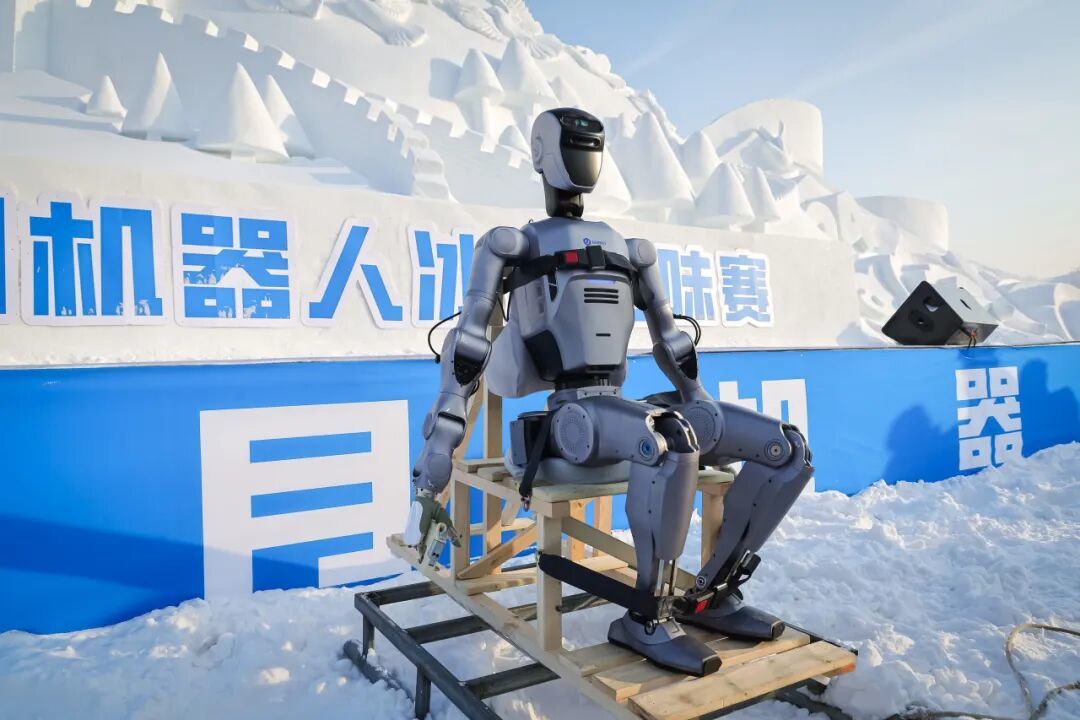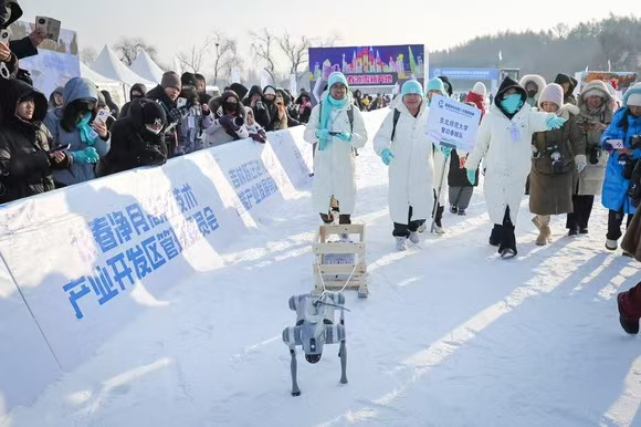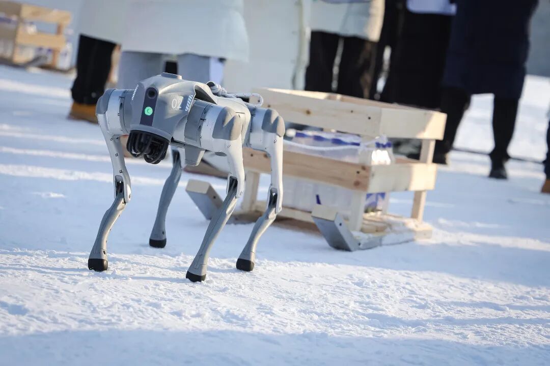 在净月潭雪世界,随着ATOM机器人鸣响发令枪,机器人雪橇运输赛率先打响。多足仿生机器人牵引着特制雪橇车,在雪道上精准穿越限宽门、连续绕桩规避障碍,最终完成卸货任务。这不仅是对机器人牵引驱动能力的展示,更体现了其在复杂低温场景下的物流运输应用潜力。