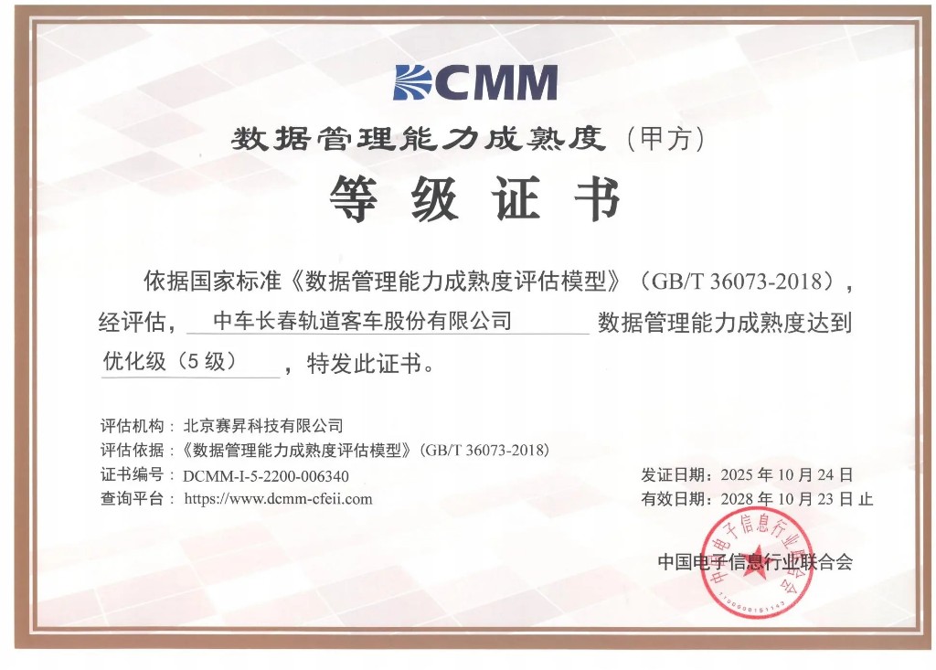 近日,中车长客正式通过国家《数据管理能力成熟度评估模型》(DCMM)最高等级——优化级(五级)认证,成为轨道交通行业首家获此殊荣的企业,标志着企业在数据管理能力上达到国内先进水平。