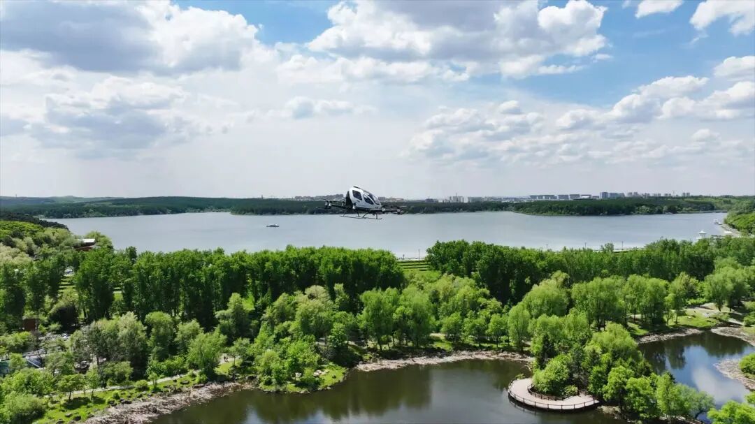 亿航EH216-S无人驾驶载人航空器在净月潭景区试飞。